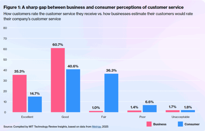 Según el estudio, el 35,3 % de las empresas encuestadas cree ofrecer una experiencia excelente a sus clientes, pero solo el 14,7 % de los consumidores la califica así. Más del 60 % de las empresas afirma ofrecer una buena experiencia, pero solo el 40,6 % de los consumidores coincide. Por otro lado, el 1 % de las empresas afirma ofrecer una experiencia regular, pero el 36,3 % de los clientes las califica de esa manera.