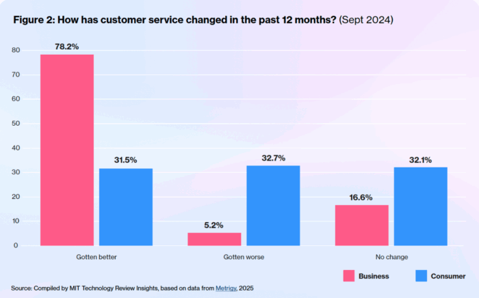 De igual forma, las mejoras implementadas por las empresas en atención al cliente aún no han sido tan perceptibles para los consumidores. Para el 78,2 % de las empresas, su servicio ha mejorado en los últimos 12 meses, pero solo el 31,5 % de los clientes está de acuerdo. Mientras tanto, el 5,2 % de las empresas afirma que su servicio ha empeorado, y el 33,7 % de los consumidores dice que la calidad del servicio ha disminuido.