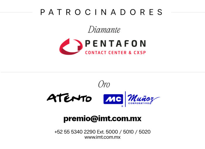 Nuestro agradecimiento a todos los asistentes y, en especial, a Pentafon, patrocinador Diamante, así como a Atento y Muñoz Corporativo, patrocinadores Oro, por su valioso apoyo y compromiso con la excelencia. Gracias a su participación, esta entrega del Premio Nacional CX & EX reafirma el propósito de impulsar una industria más innovadora, humana y enfocada en las personas.